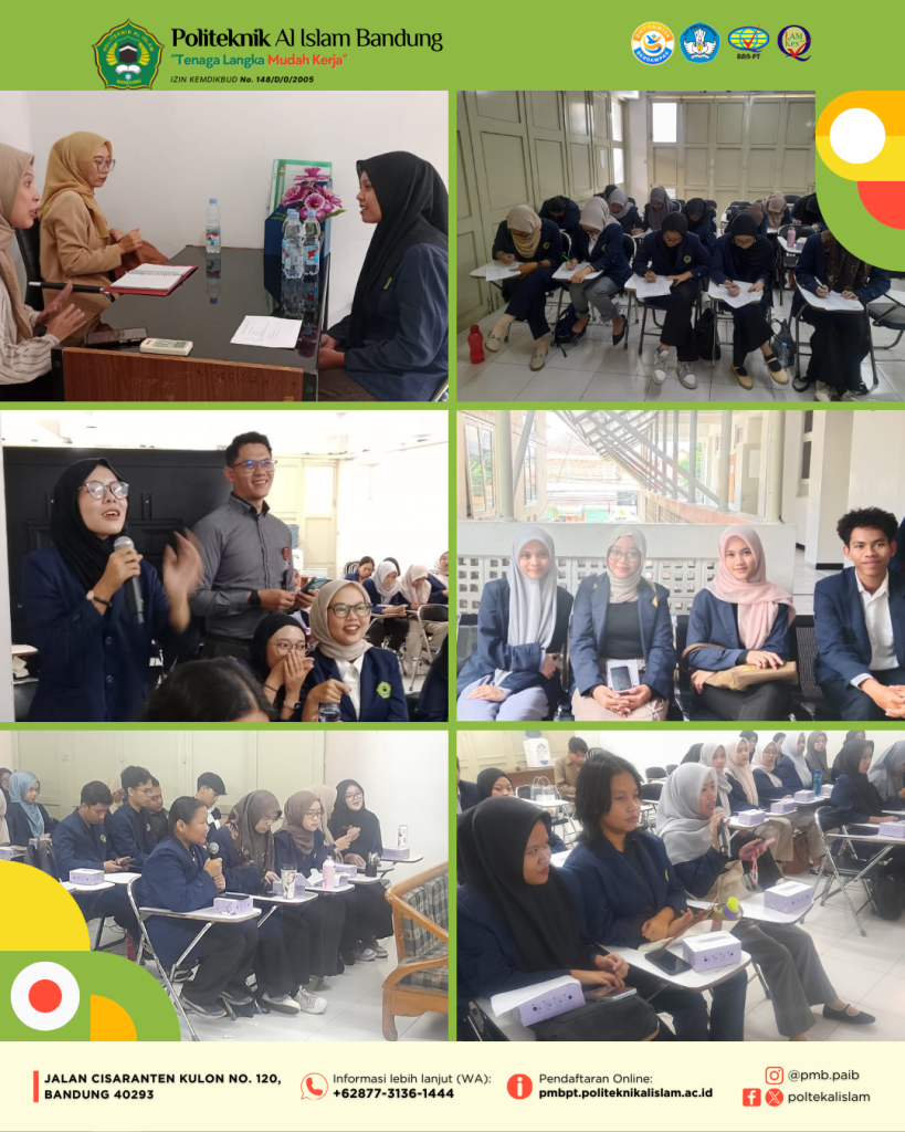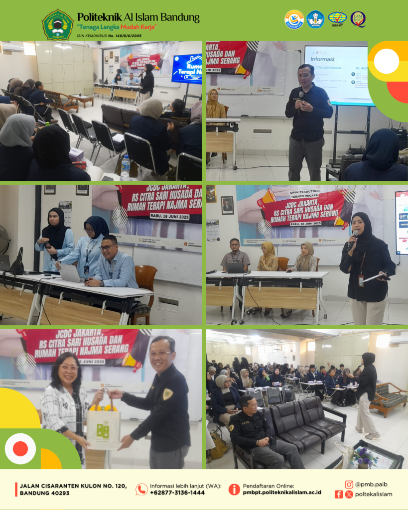 Bandung, 18 Juni 2025 — Pusat Karir dan Inkubator Bisnis (PKIB) Politeknik Al Islam Bandung (PAIB) sukses menyelenggarakan kegiatan Open Recruitment Terapis Wicara yang menghadirkan Dunia Usaha dan Dunia Industri serta Dunia Kerja (DUDIKA) dari sejumlah fasilitas pelayanan kesehatan ternama, yaitu JCDC Jakarta, RS Citra Sari Husada, dan Rumah Terapi Najma Serang.
