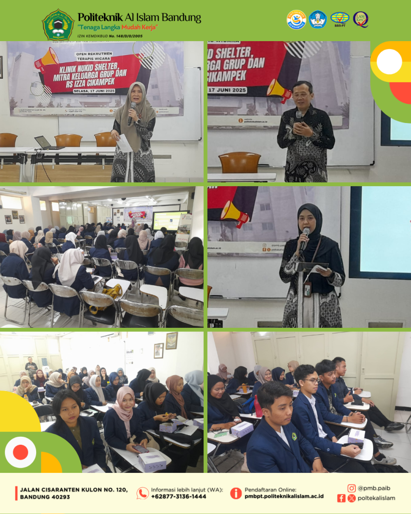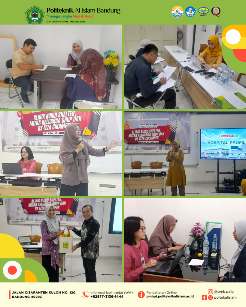 Bandung, 17 Juni 2025 — Pusat Karir dan Inkubator Bisnis (PKIB) Politeknik Al Islam Bandung menggelar kegiatan Open Rekrutmen Terapis Wicara, bekerja sama dengan Klinik Nukid Shelter, Mitra Keluarga Grup, dan RS Izza Cikampek. Acara ini diikuti oleh seluruh mahasiswa Program Studi Terapi Wicara PAIB dan berlangsung di kampus utama.