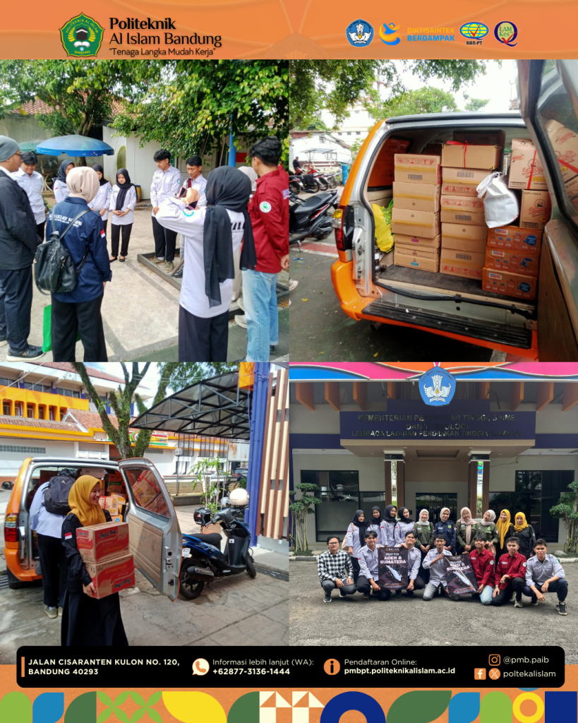 Bandung, 31 Desember 2025 — Organisasi Mahasiswa (ORMAWA) Politeknik Al Islam Bandung (PAIB) yang terdiri dari BLM, BEM, HIMARAD, HIMATERA, dan HIMAARS menyalurkan donasi kemanusiaan untuk korban bencana alam di wilayah Sumatera. Penyerahan donasi tersebut dilaksanakan, bertempat di Kantor LLDIKTI Wilayah IV Jawa Barat dan Banten. (31/12)