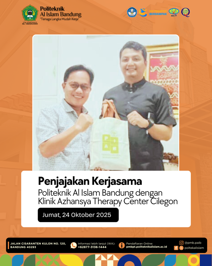 Bandung, 24 Oktober 2025 — Politeknik Al Islam Bandung melaksanakan kegiatan penjajakan kerjasama dengan Klinik Azhansya Therapy Center Cilegon, yang diwakili langsung oleh pemilik klinik. Pertemuan ini berlangsung di kampus Politeknik Al Islam Bandung pada hari Jumat, 24 Oktober 2025.