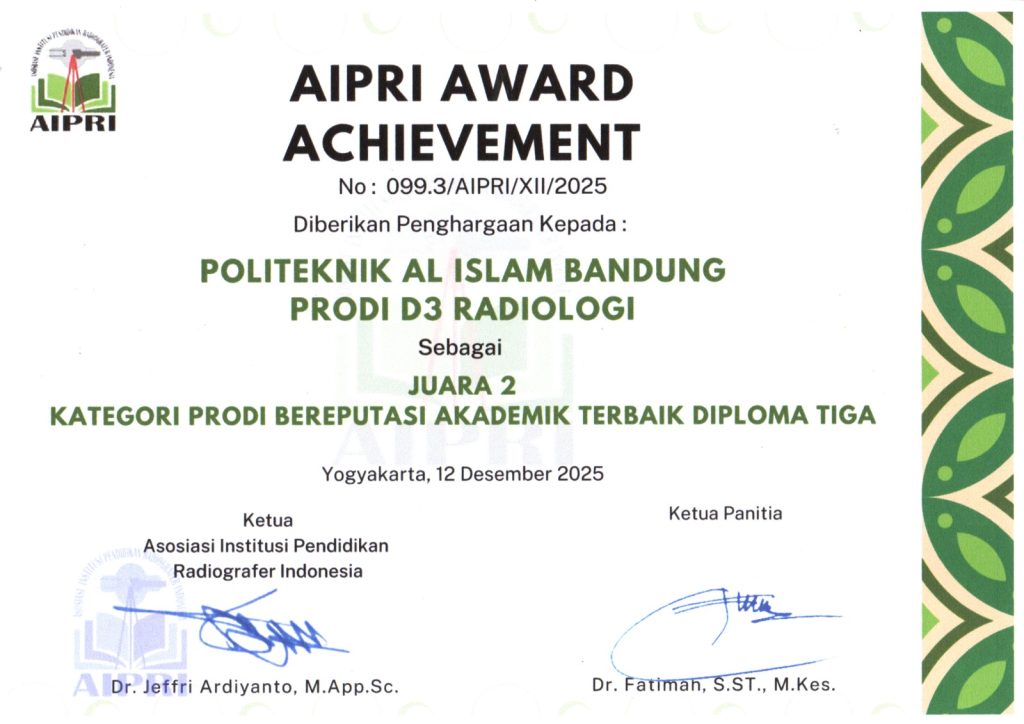 Sertifikat penghargaan ditandatangani oleh Ketua Asosiasi Institusi Pendidikan Radiografer Indonesia dan Ketua Panitia AIPRI Award. Capaian ini menjadi salah satu bentuk pengakuan nasional terhadap kinerja akademik Politeknik Al Islam Bandung, khususnya pada bidang pendidikan radiologi.