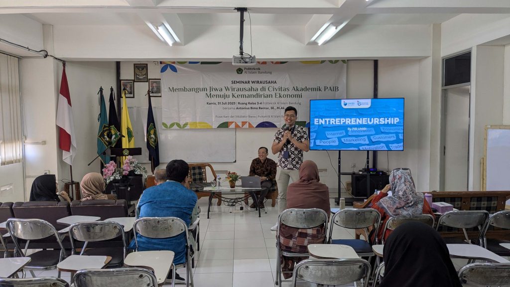 Bandung, 31 Juli 2025 – Pusat Karir dan Inkubator Bisnis Politeknik Al Islam Bandung (PAIB) menyelenggarakan Seminar dan Workshop bertajuk “Membangun Jiwa Wirausaha di Civitas Akademik PAIB Menuju Kemandirian Ekonomi”. Kegiatan ini bertujuan untuk menanamkan semangat kewirausahaan di kalangan mahasiswa dan sivitas akademika sebagai langkah awal menuju kemandirian ekonomi.