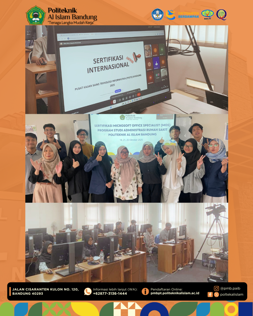 Bandung, 25 Oktober 2025 – Politeknik Al Islam Bandung sukses melaksanakan kegiatan Sertifikasi Internasional Microsoft Office Specialist (MOS) yang diikuti oleh 10 mahasiswa Program Studi Diploma Tiga Administrasi Rumah Sakit Angkatan 22 serta 4 tenaga kependidikan (tendik).